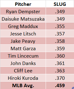 Maddux was still schooling hitters at the end of his career in 2008, despite possessing raw stuff that wouldn't have landed him so much as a minor league deal. He had no fastball to speak of, throwing the pitch at an average speed (84.3 MPH) that bested only Jamie Moyer (80.9 MPH) among qualified starters. Just about nobody swung through Maddux's "heat," as his whiff rate (7.1 percent) was barely half of the league average (14 percent). Yet, Maddux got elite results with an ultra-slow pitch that elicited scads of contact. Among qualified starters, only Ryan Dempster and Daisuke Matsuzaka had a lower opponent slugging percentage on fastballs thrown:
