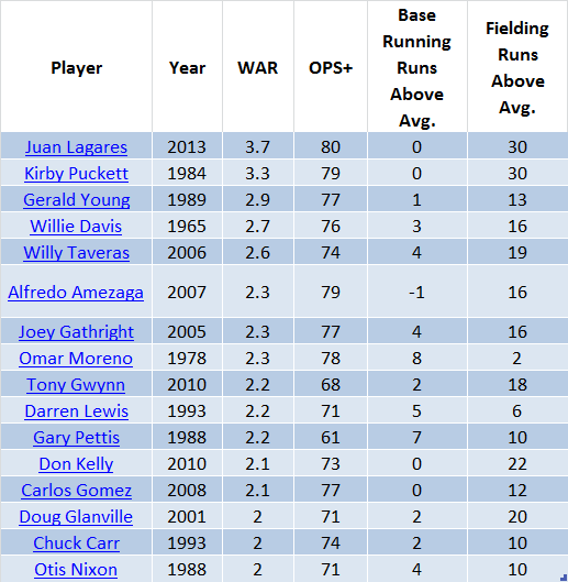 Just 16 outfielders have managed to be at least an average starter (defined here as two Wins Above Replacement) during a season in which they posted a park-and-league-adjusted OPS (OPS+) that was 20 percent or more below the MLB average. To make that many outs and still provide value, these guys had to cover serious ground and create havoc when they did manage to get on base.