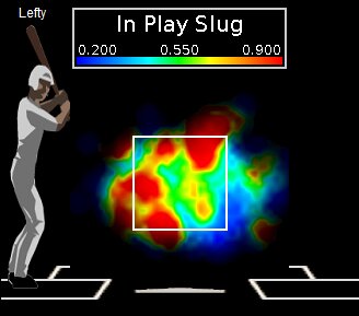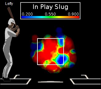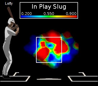 Having watched Ibanez in his time as a Phillie, I have noticed his problems with fastballs. At 38 years old, it seems like his bat speed has been in decline and thus has been rather helpless trying to make solid contact on fastballs. The following images show his in-play slugging percentage on fastballs, the first showing data from April 5 to June 13, 2009 and the second showing everything since.