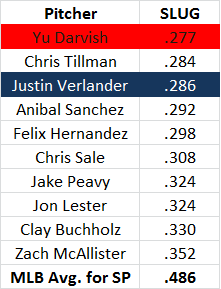 Verlander is averaging "just" 93.3 MPH with his fastball, tying him with David Price, Justin Masterson and Derek Holland for highest among American League starters. Darvish also ranks in the top ten, averaging 92.8 MPH. Those lofty radar gun readings are translating into precious little hard contact for opposing hitters: