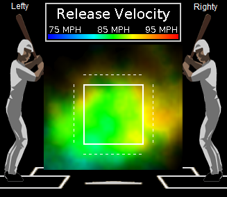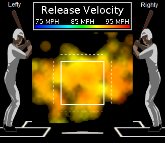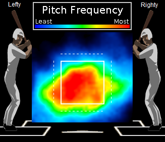 Shockingly, Silva was actually pretty good in Chicago. He had a 100 ERA+ in 113 innings, striking out far more batters than ever before (6.4 K/9) while still being stingy with the walks (1.9 BB/9). Silva radically changed his approach: while he threw a fastball nearly 70% of the time in 2008 and 2009, he went to his not-so-hopping heater about 57% with the Cubs, mixing in more changeups and sliders. Check out the difference in his opponent contact rate in 2008-09 and then 2010. Keep an eye on the low-and-away area for righty batters, where most of Silva's stuff was located:
