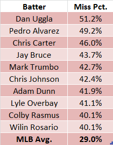 Uggla is especially flailing against soft pitches thrown around eye-level. His miss rate versus breaking and off-speed pitches thrown in the upper third of the strike zone has spiked from 26.7 percent in 2012 to 45.5 percent in 2013.