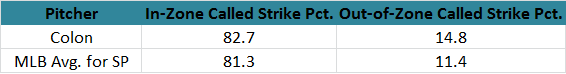If there's one advantage to being a soft-tosser, it's that umps are more likely to give you the benefit of the doubt on close calls. Colon is a prime example of this phenomenon, enjoying a higher called strike rate than the average MLB starter both on pitches thrown inside of the strike zone and off the plate: