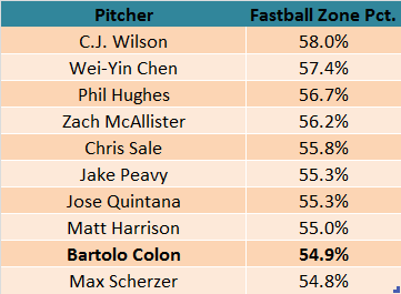 Highest percentage of fastballs thrown within the strike zone among AL starters, 2011-13