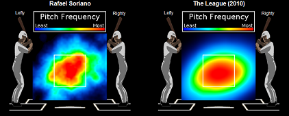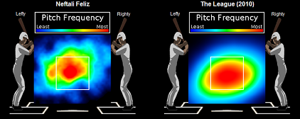 Neftali Feliz's 2010 Pitch Frequency (1072 pitches) vs. All 2010 Major League RHPAll three of the above closers tend to pitch to the middle of the plate, a striking contrast to Rivera's pitch frequency.