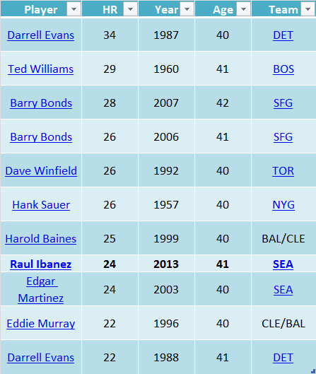 Ibanez's power display is impressive for a batter at any age, but it's nearly unprecedented for a guy who's closer to AARP eligibility than the beginning of his career. Even if he cools off in the second half, Ibanez looks primed to break the single-season home run record for a player in his forties: