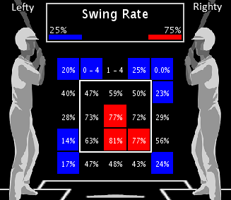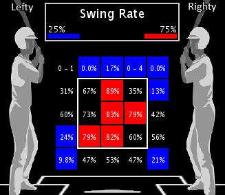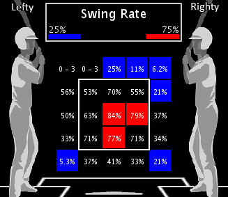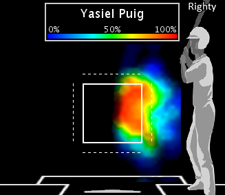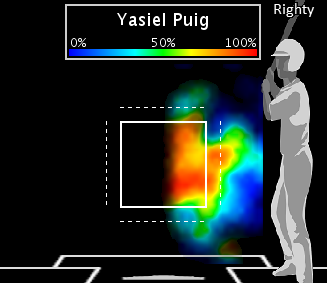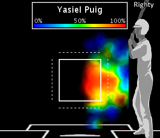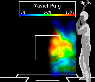 When Puig debuted back in June, he displayed the patience of a kindergartener hell-bent on cracking open a Hershey-stuffed pinata. He swung at 38.3 percent of pitches thrown outside of the strike zone, which was far above the 28 percent major league average and second-highest among all National League hitters that month (Alfonso Soriano was first, at 46.6 percent). Puig was particularly hack-happy on pitches thrown inside, chasing 36.2 percent of the time.